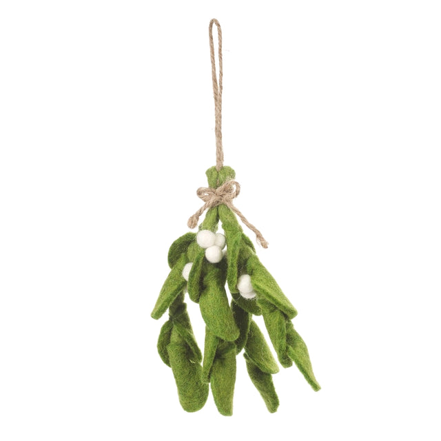 Add a touch of nature to your holiday decor with our Handmade Felt Mistletoe Ornament. Made with biodegradable wool and organic dyes, this needle felted sprig is tied together with natural rope. A pet-friendly and long-lasting option, perfect for year after year use.