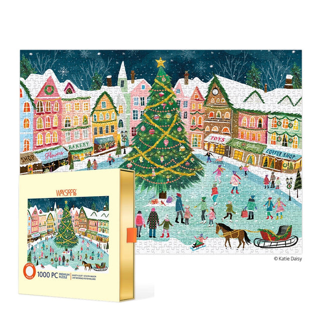 Lace up your skates and glide into a picture-perfect winter wonderland with the Town Square Holiday Puzzle, a 1000-piece jigsaw that captures the joy of a snowy evening filled with twinkling shop windows, cheerful skaters, horse-drawn sleighs, and a grand Christmas tree. Sprinkled with glittering accents that shimmer like fresh snow, this festive puzzle is printed on 100% recycled paperboard with non-toxic vegetable inks, offering a holiday activity that’s as kind to the planet as it is full of seasonal charm.