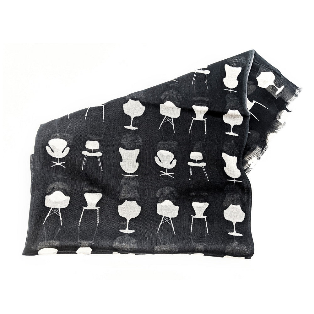 Show off your love for mid-century design with this modal cotton scarf. Modal scarves are made of natural cellulose fibers, often modified viscose fabrics. After processing the material is easier to work with than cotton. Modal scarves curl less than cotton scarves, which gives them a smooth, elegant look. This scarf is stylishly frayed at the ends and features a black and off-white print of Eames-era chairs. Wear it like a traditional scarf or open it up to wear like a shall.