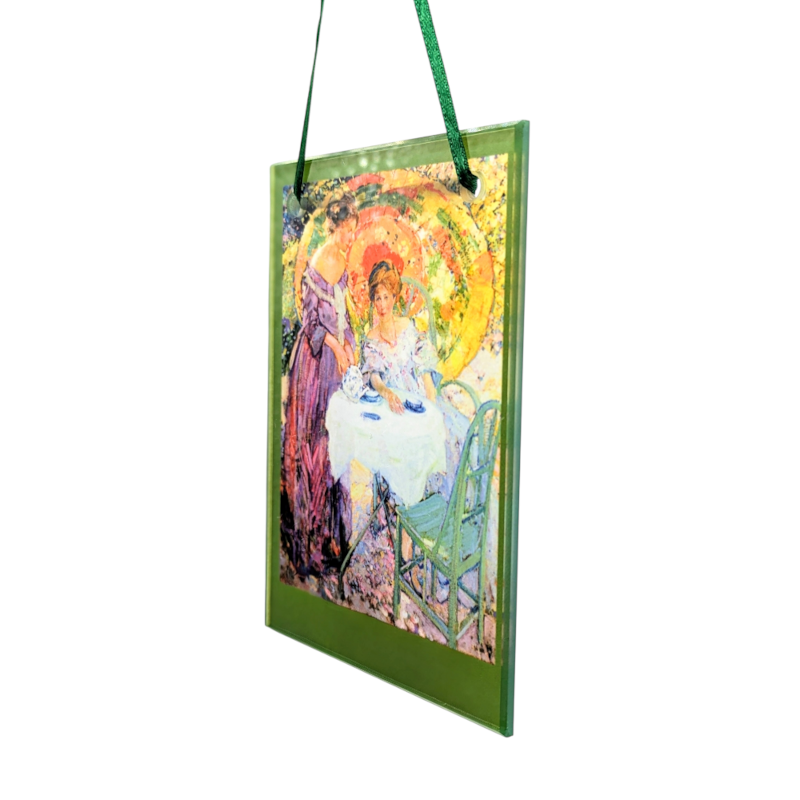 A Newfields exclusive, this mini glass panel features Afternoon Tea (1910) by Richard E. Miller (American, 1875–1943), a radiant example of American Impressionism from the permanent collections of the Indianapolis Museum of Art at Newfields. The artwork is reproduced on glass and framed by a translucent green border that enhances the painting’s vibrant palette, with a coordinating ribbon for easy hanging.